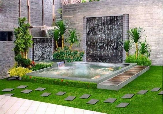 13. Kolam Ikan Minimalis dengan Aksen Air Terjun Mini