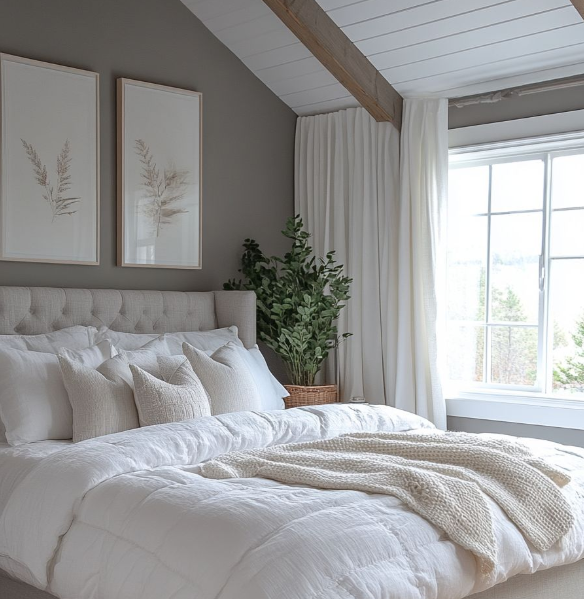 Kombinasi abu-abu dan putih menciptakan suasana kamar yang minimalis dan modern. Warna putih memberikan efek terang, sementara abu-abu menambah dimensi pada ruang, membuatnya terlihat luas dan rapi.