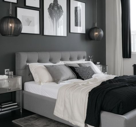 Warna hitam menambahkan kesan dramatis yang elegan jika dipadukan dengan abu-abu. Kombinasi ini cocok untuk Anda yang ingin menciptakan kamar dengan nuansa bold namun tetap stylish.