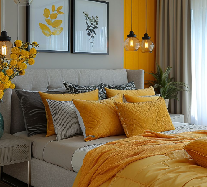 Kuning mustard yang cerah menciptakan kontras menyegarkan dengan abu-abu. Warna ini dapat digunakan pada aksen dinding atau furnitur untuk menambahkan semangat pada kamar Anda.