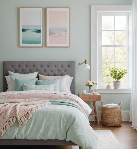 Hijau mint yang lembut memberikan kesegaran pada kamar abu-abu. Kombinasi ini cocok untuk menciptakan kamar dengan suasana santai dan alami.