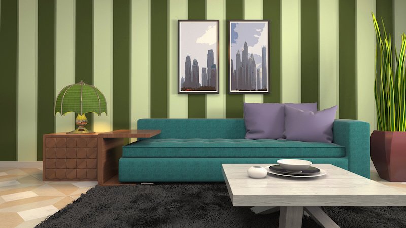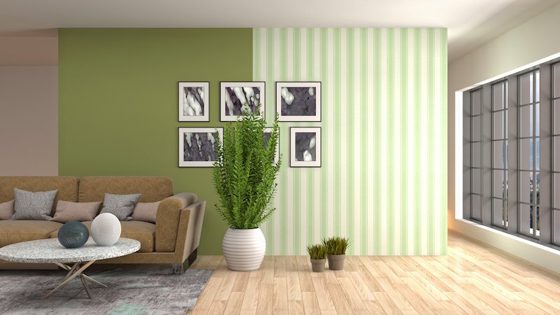 Dinding ruangan yang dihiasi dengan pola garis vertikal menggunakan warna hijau muda dan hijau tua menampilkan desain yang segar dan modern. Kombinasi ini juga menciptakan ilusi ruang yang lebih luas dan memberikan sentuhan visual menarik.