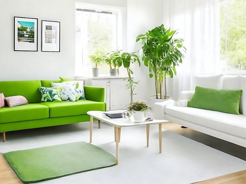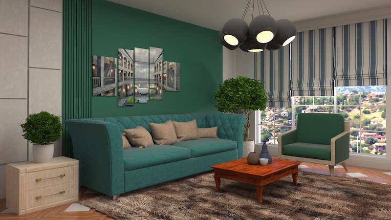 Selain itu, penggunaan furniture, seperti sofa hijau toska dan meja putih menambah kesan bersih dan teratur di ruangan. Tidak lupa, lampu meja dengan penutup berwarna hijau serta tanaman hias di sudut ruangan semakin memperkuat nuansa alami dan segar. Setiap kombinasi warna hijau tersebut berhasil menciptakan suasana ruangan yang harmonis dan estetis.