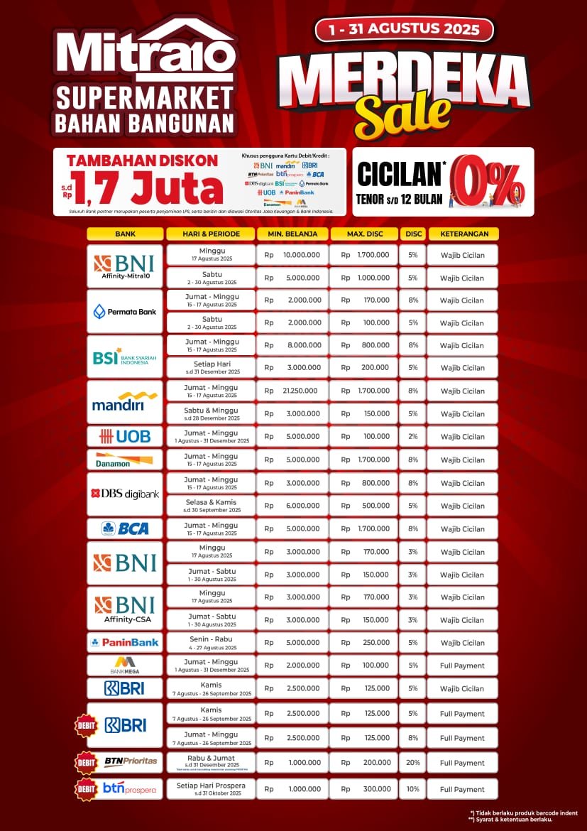 Di bulan Agustus ini, member Mitra10 bisa merasakan langsung berbagai keuntungan: mulai dari cicilan 0% hingga 12 bulan, diskon bank partner sampai Rp1,7 juta, hingga cashback tambahan. Semua keuntungan ini semakin menguatkan posisi Mitra10 sebagai supermarket bahan bangunan yang murah, lengkap, dan nyaman bagi masyarakat Indonesia.