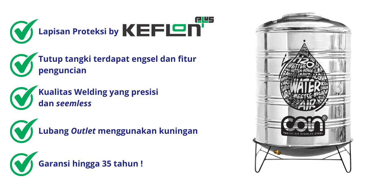 Lapisan pelindung atau coating adalah benteng utama yang menentukan umur panjang sebuah tangki air. Lapisan ini melindungi bodi tangki dari korosi dan cuaca ekstrem. Contohnya, Tangki Air Stainless Steel COIN sudah dilengkapi dengan teknologi KEFLON® pada bagian dalam, dan versi terbarunya menggunakan KEFLON PLUS® — proteksi ganda di dalam dan luar tangki.