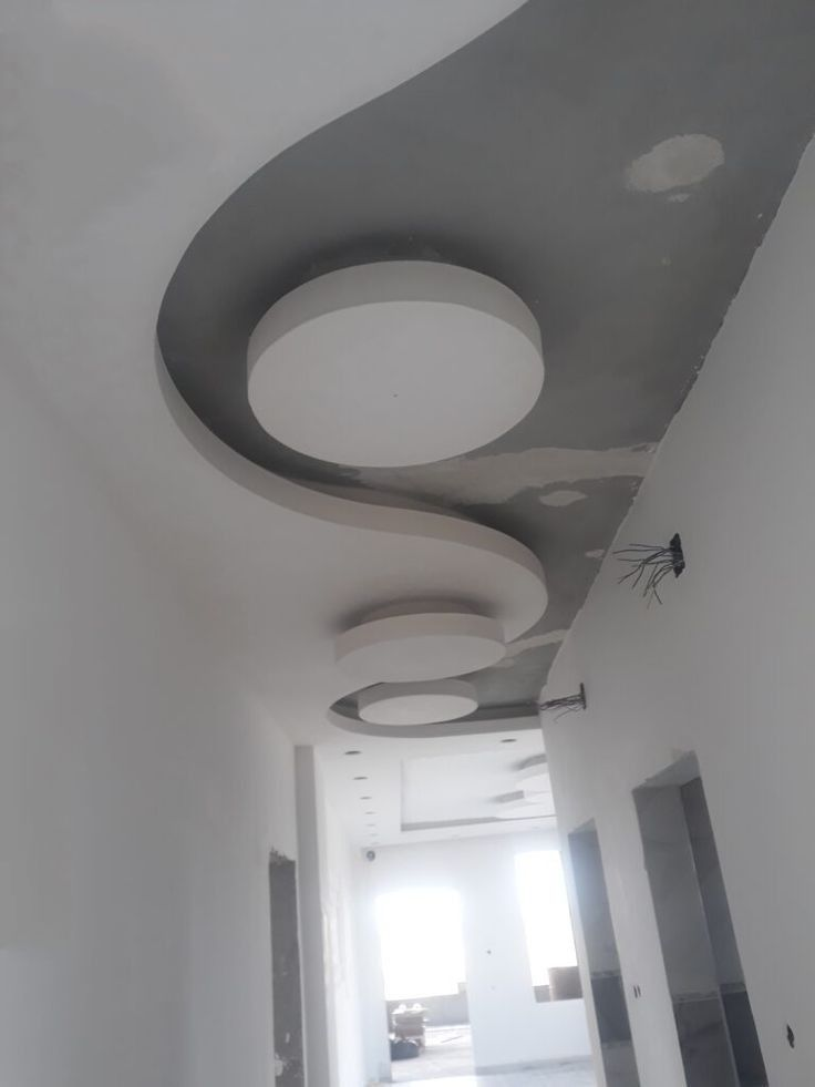Plafon gypsum dengan pola geometris memberikan tampilan kontemporer yang artistik. Desain ini biasanya cocok untuk ruangan yang ingin tampil lebih berani tanpa menghilangkan kesan minimalis.