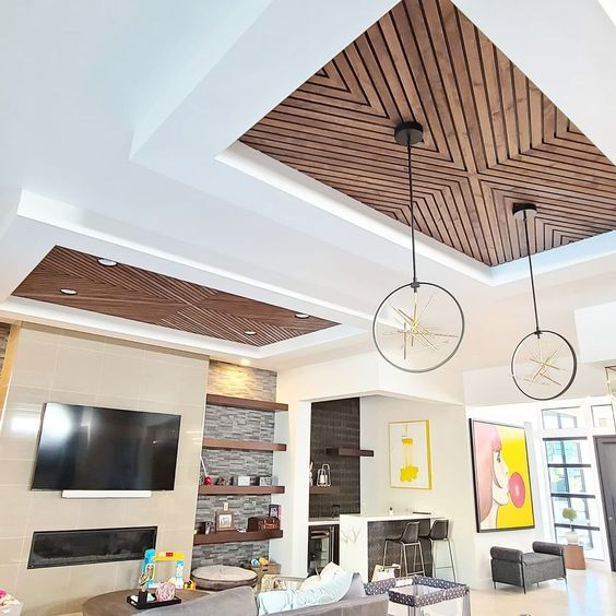 Sentuhan kayu di plafon memberikan nuansa hangat dan natural yang menyeimbangkan desain minimalis modern. Biasanya digunakan di ruang tamu atau area lounge untuk menciptakan suasana cozy.