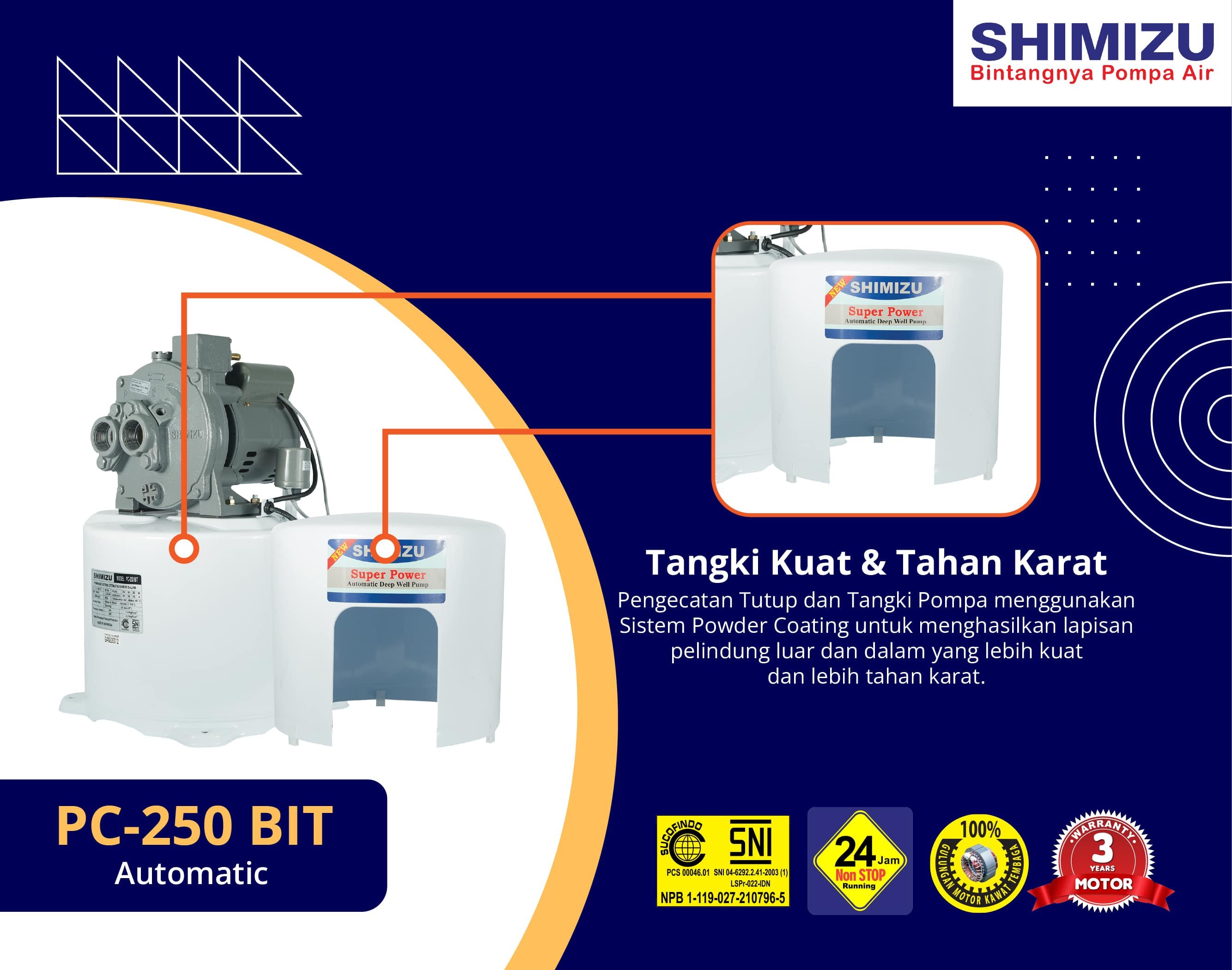 Dilengkapi dengan lapisan powder coating anti karat, impeller bahan Noryl, serta sistem otomatis yang praktis, pompa ini terbukti andal untuk pemakaian jangka panjang. Tidak heran jika SHIMIZU PC-250 BIT menjadi salah satu rekomendasi pompa air terbaik 2025 untuk rumah tangga Indonesia.