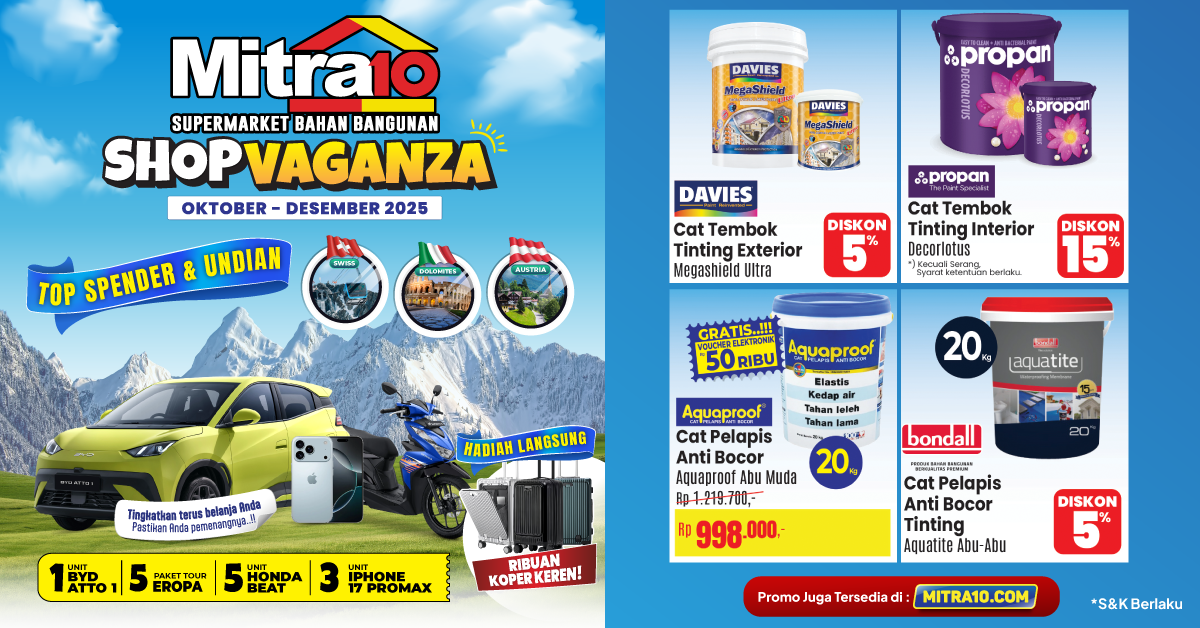 Semua kebutuhan perawatan rumah agar tetap aman di musim hujan bisa Anda temukan lengkap di Shopvaganza Mitra10 — mulai dari cat anti lembab, pelapis anti bocor, genteng tahan cuaca, hingga material bangunan berkualitas. Momen terbaik untuk belanja cerdas adalah sekarang, karena #SelengkapItu untuk Rumah Aman hadir untuk Anda dan keluarga.