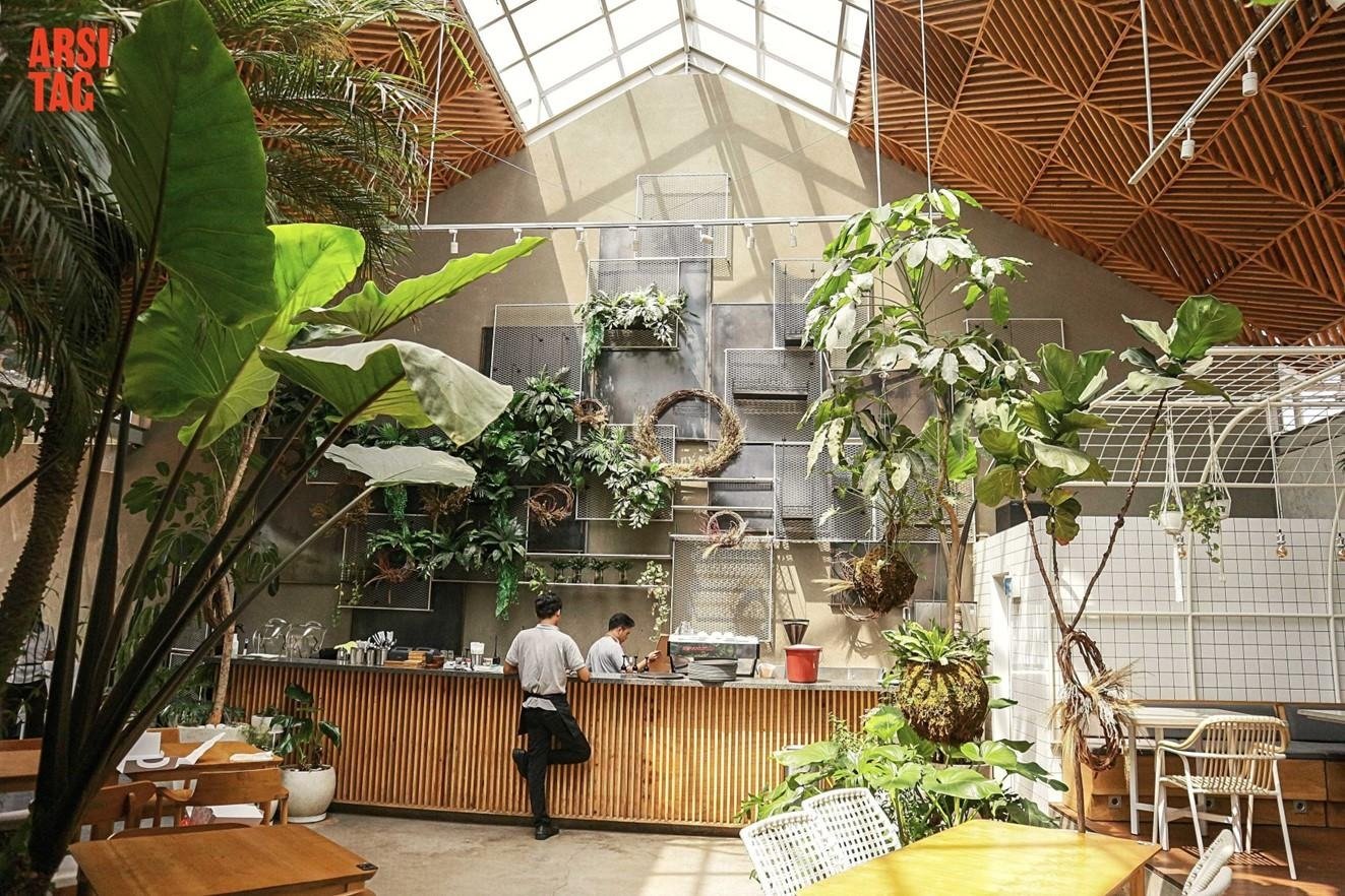 Kafe ini menghadirkan atmosfer yang segar dan memikat dengan desain taman yang menyatu, memberikan pengalaman visual yang nyaman dan menarik bagi pengunjung muda. Rimbunnya tanaman dan harmonisasi warna, bahkan hingga detail atap, menciptakan daya tarik tanpa berlebihan. Konsep desain taman yang menyatu dengan indoor kafe tentu bisa menjadi spot yang instagrammable untuk berfoto ria bersama teman, pasangan, atau keluarga.