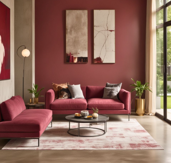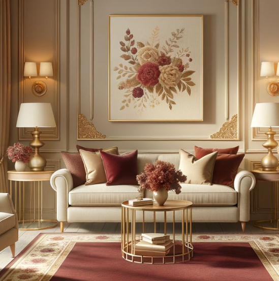 Tambahkan sentuhan glamor dengan kombinasi merah bata dan aksen emas. Ideal untuk ruang makan formal atau ruang tamu.