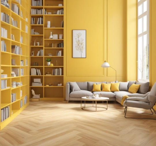 Warna kuning terang memberikan energi dan keceriaan, cocok untuk dapur atau ruang bermain anak.