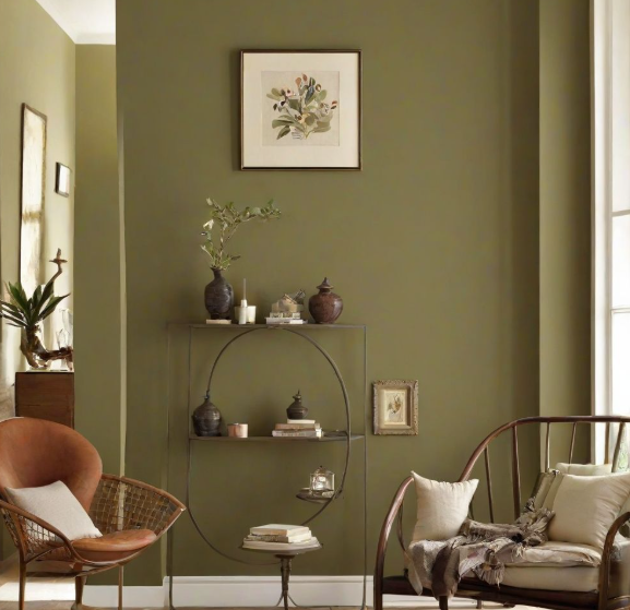 Hijau zaitun menciptakan suasana alami yang menyejukkan. Warna cat tembok ini sangat cocok untuk ruang keluarga atau dapur dengan tema natural.
